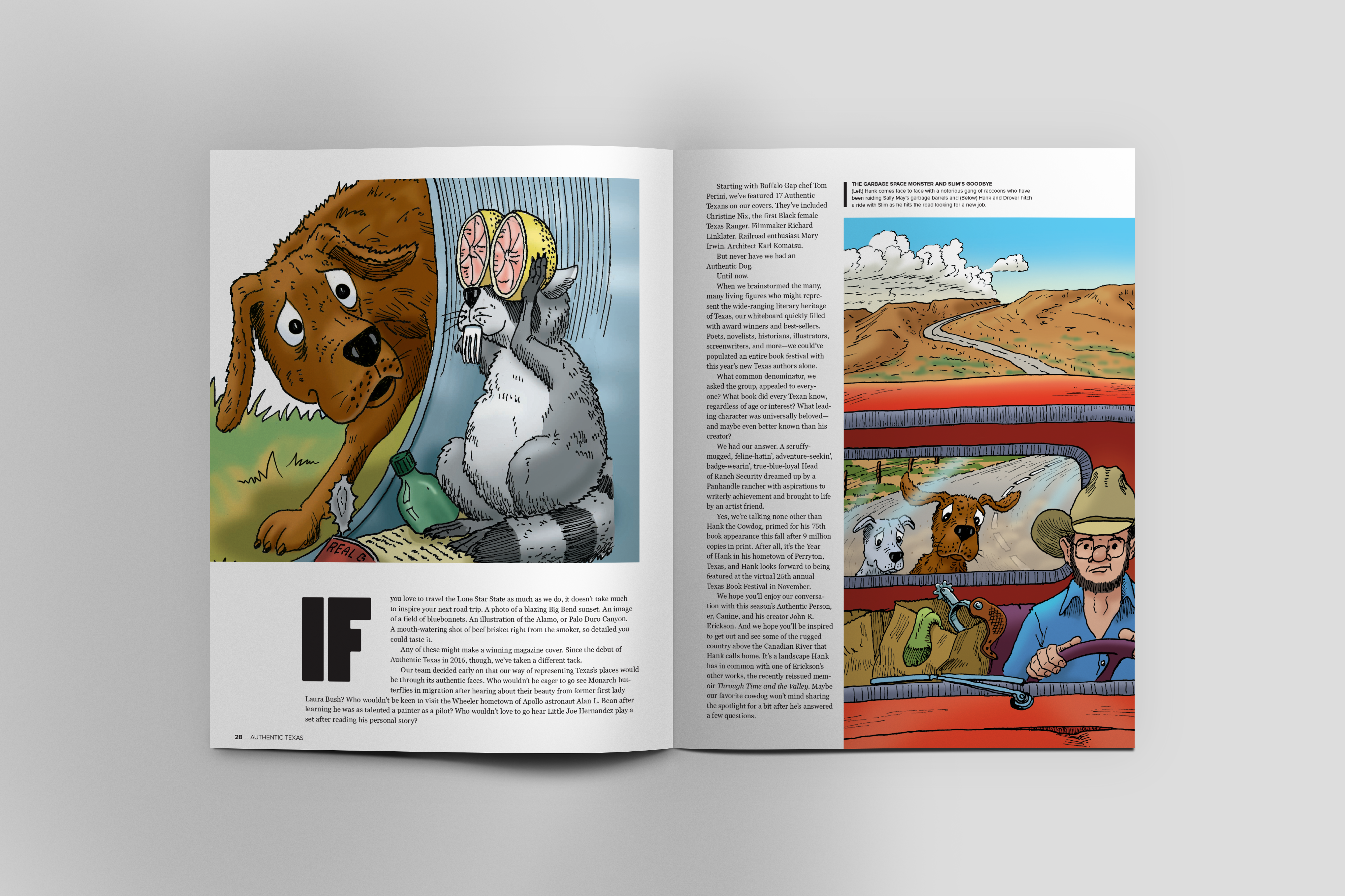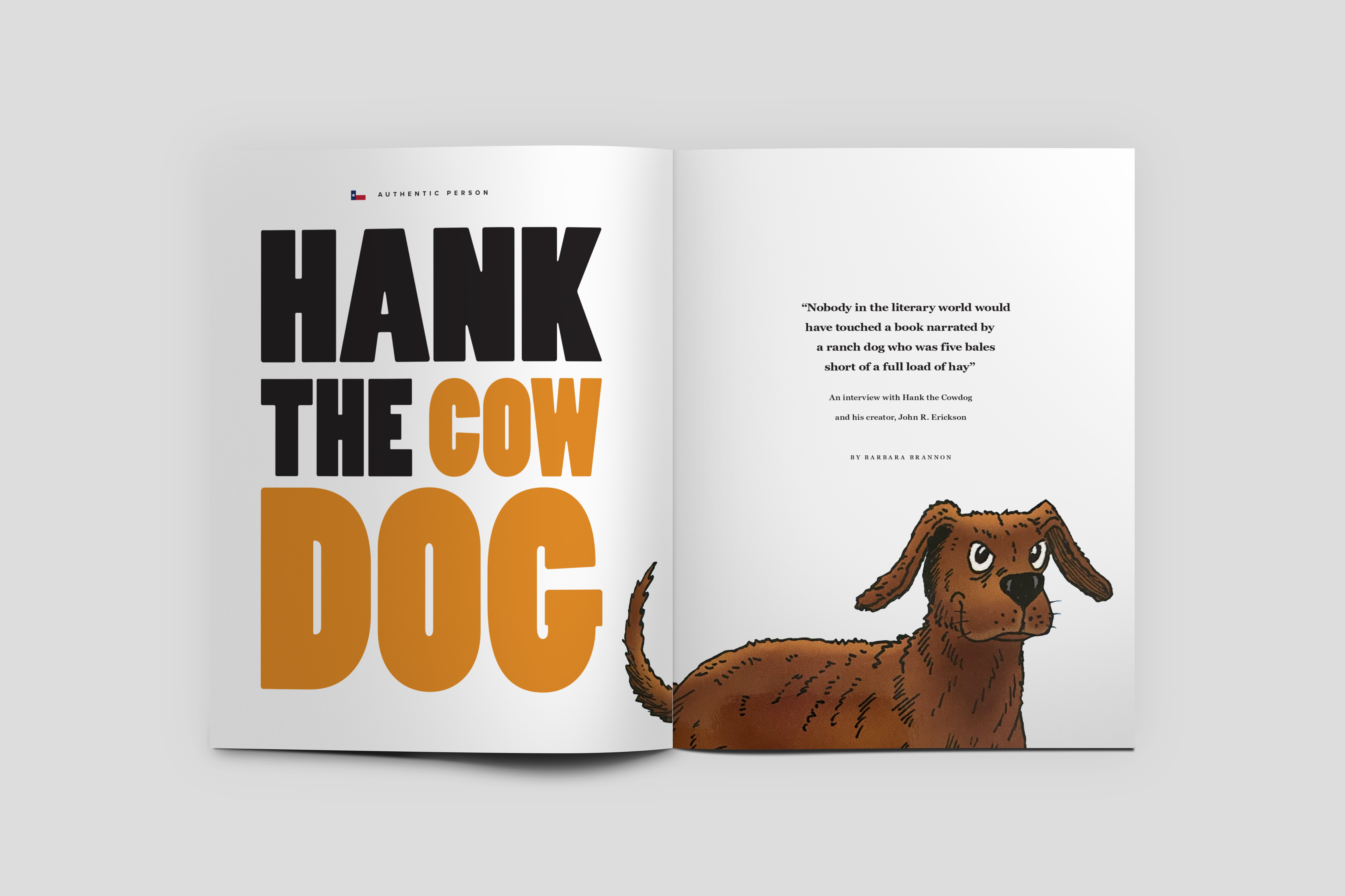 Issue focuses on literary heritage and history throughout Texas with Hank The Cowdog featured on the cover and as the magazine’s first Authentic Dog. Working with Author, John Erickson and Nikki Early, I was given permission to fully restore the original illustration of Hank The Cowdog that was originally hand drawn by the series illustrator, Gerald Holmes.