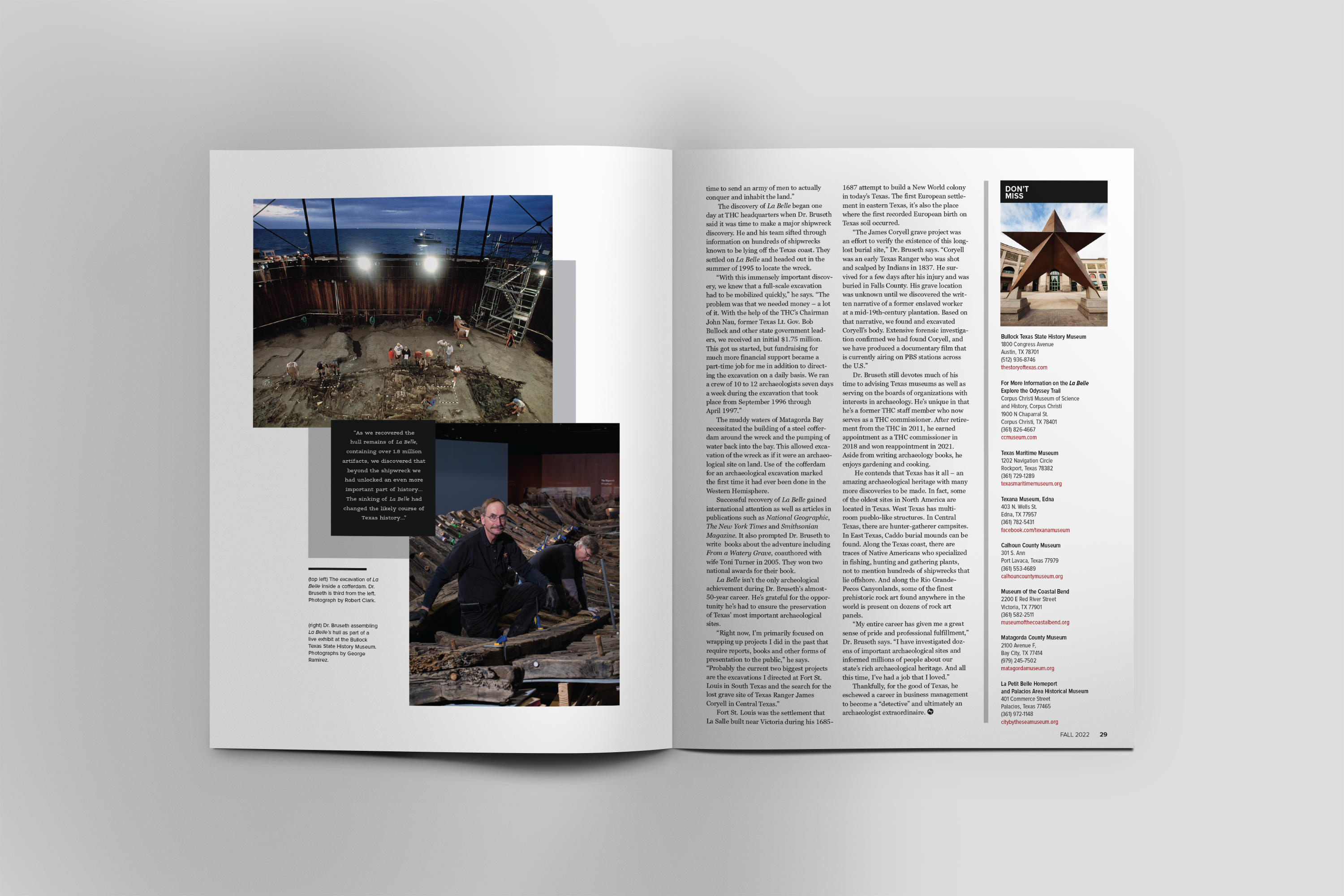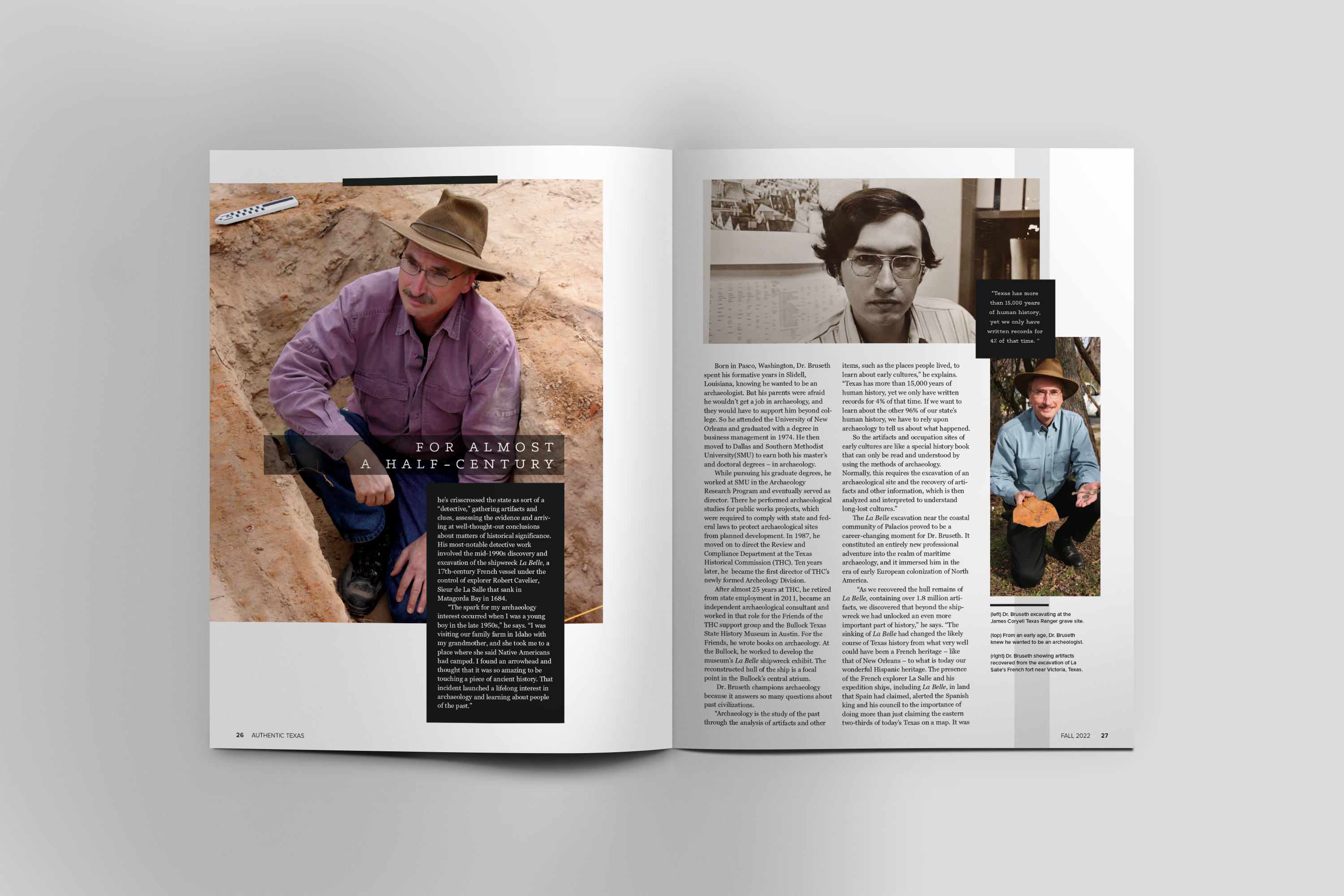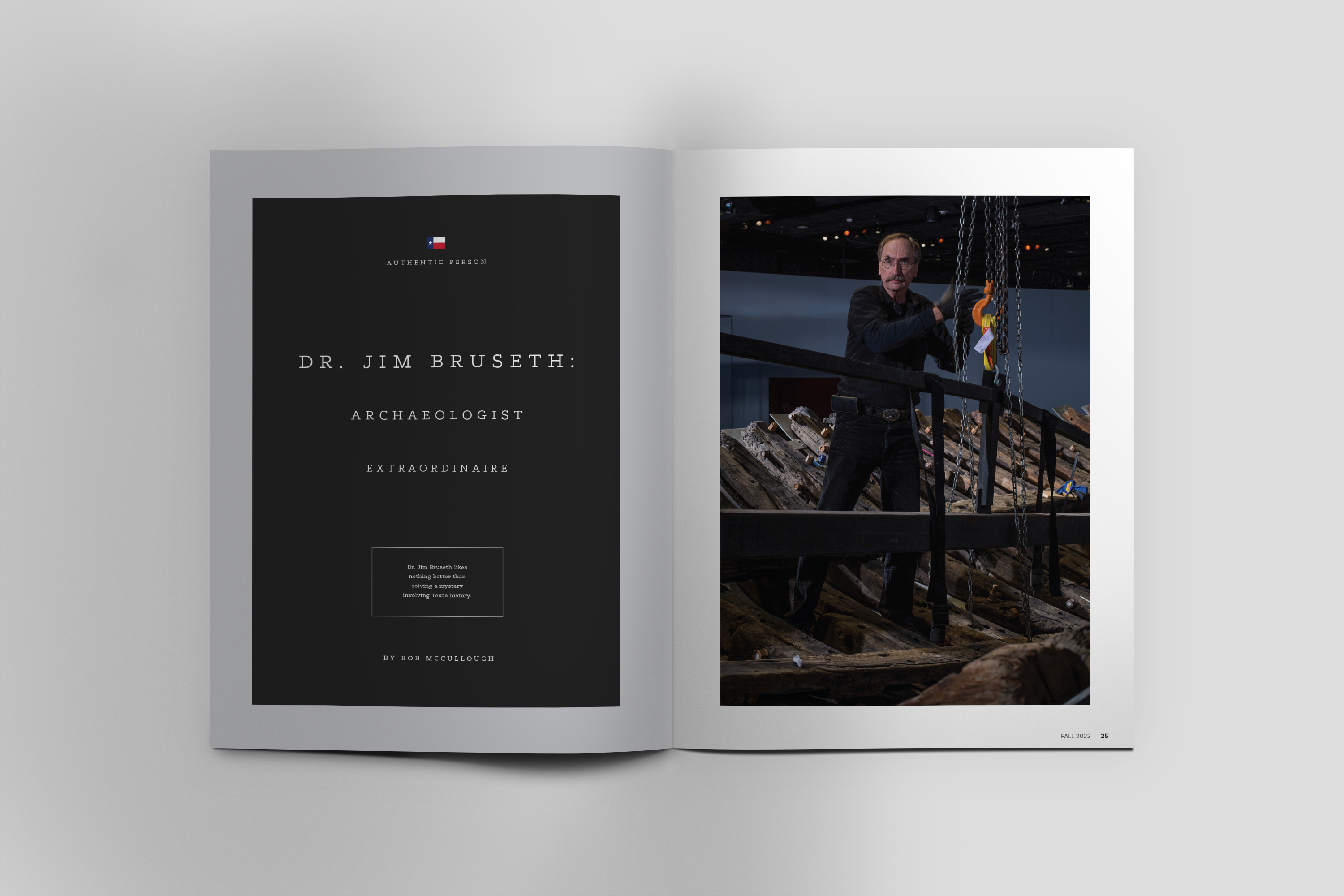 This issue of Authentic Texas focuses on the many visitable prehistoric sites across the state, pre-history Texas and our own “Indiana Jones” Archeologist, Dr. Jim Bruseth who discovered the lost shipwreck La Belle off of the Texas coast.